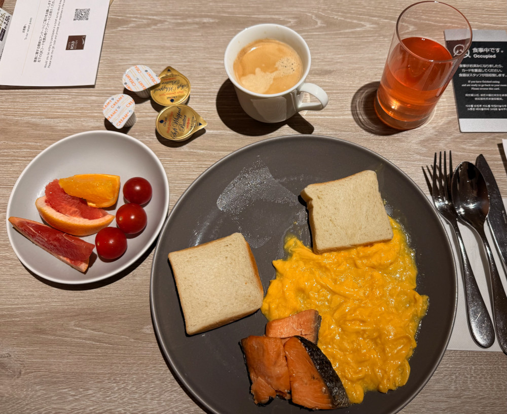 Amiria was correct–the buffet was excellent, with many differing dishes–the majority featuring traditional Japanese breakfast options. Of course, there were too many choices. I always have trouble choosing food when the selection is unlimited–it’s so easy to serve too much of a specific item. I’m rarely hungry for the first couple of hours after I wake up, and I still haven’t learned the Scandinavian way of taking tiny portions at a time, but I did my best. I started with eggs, toast and salmon, but then wished I’d avoided the scrambled eggs, as the Japanese version is only just cooked, and very runny.