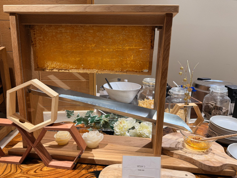 There was a counter (well-frequented by the younger set) where you could make your own mini pancakes and decorate them with fruit syrups and cream. Runny honey was dispensed via a wooden contraption featuring a frame of honeycomb suspended over a chute that collected the drips and fed them into a glass dish with a wooden honey dipper. Fancy!