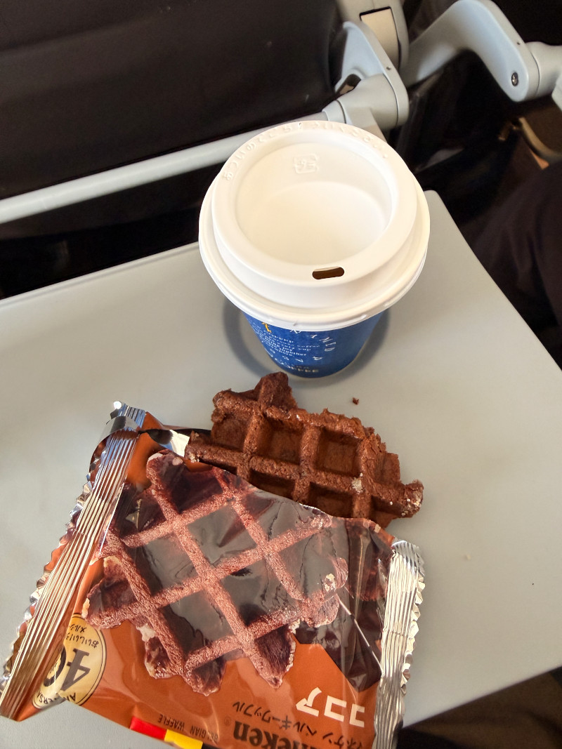 My Jetstar snack: a hot coffee and a cocoa waffle.