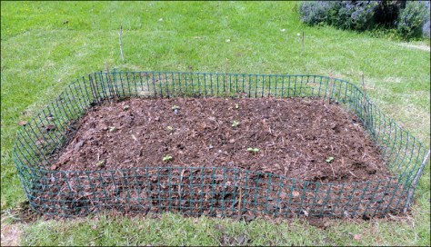 The bed is in the middle of the lawn close to the house so we can easily keep an eye on it, but already the sparrows have been in and have tossed the compost around. Fingers crossed the plants will get their roots going and dig in before they, too, are evicted. Only the rock melons are planted for now; I need twice as much space to fit the watermelons in as well.