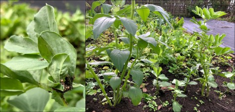 The broad bean plants were only a few centimetres tall in June, but now we’re consuming their crop. I like to nuke the beans into a paste with a little butter and miso. The plants themselves have grown far taller than we expected. The seed packet suggested staking them at one metre, but they’ve kept on growing, and now reach to over two metres. Every time a wind has howled in from a new direction, we’ve had to scurry outside to re-tie them.