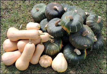 Squash ‘Butternut Chieftain’ and ‘Burgess Buttercup’, with ‘Thelma Saunders Sweet Potato’ in the foreground.